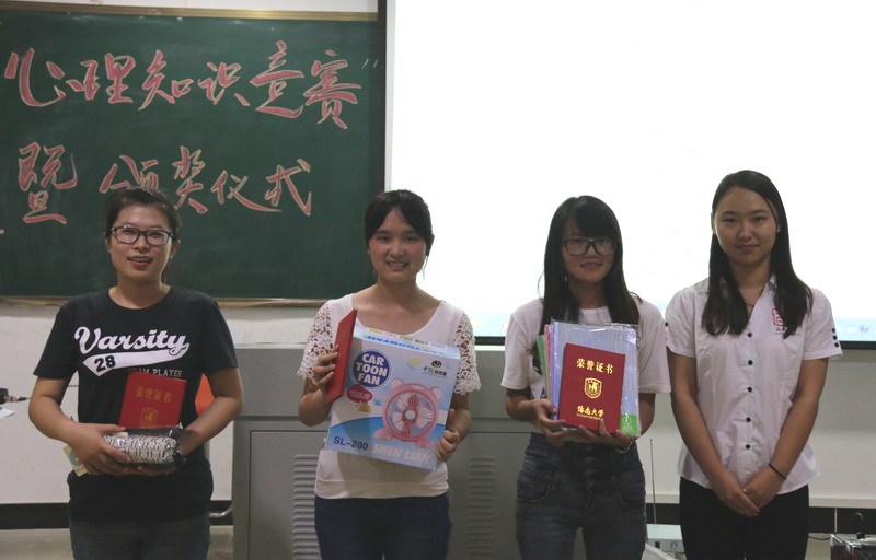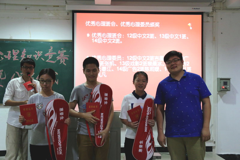 对在心理健康活动月中表现突出的班级和学生进行了嘉奖。先后颁发了“优秀心理班会”3个、“优秀心理委员”6人、心晴“优秀写手”3人、“橱窗大赛”7人。同时,心理知识竞赛经过三轮的激烈比拼,产生了一等奖、二等奖、三等奖各一名,网络投票产生“最佳人气奖”一名。 走近心理,了解自己。本次心理知识竞赛的顺利举办使大家进一步走近自己的心理,了解到了更多的心理知识,消除了心理健康方面的误区和盲区,让黑料正能量