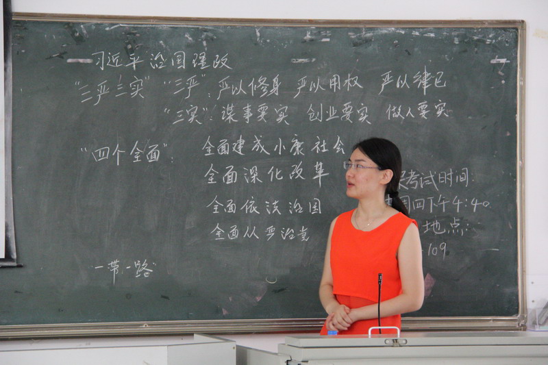 学生张亚萍和“中国自强之星”我校学生何美丹的优秀案例。最后,王静老师通过板书的方式向大家介绍了习近平总书记治国理政的“三严三实”、“四个全面”、“一带一路”等等各项党的方针政策。