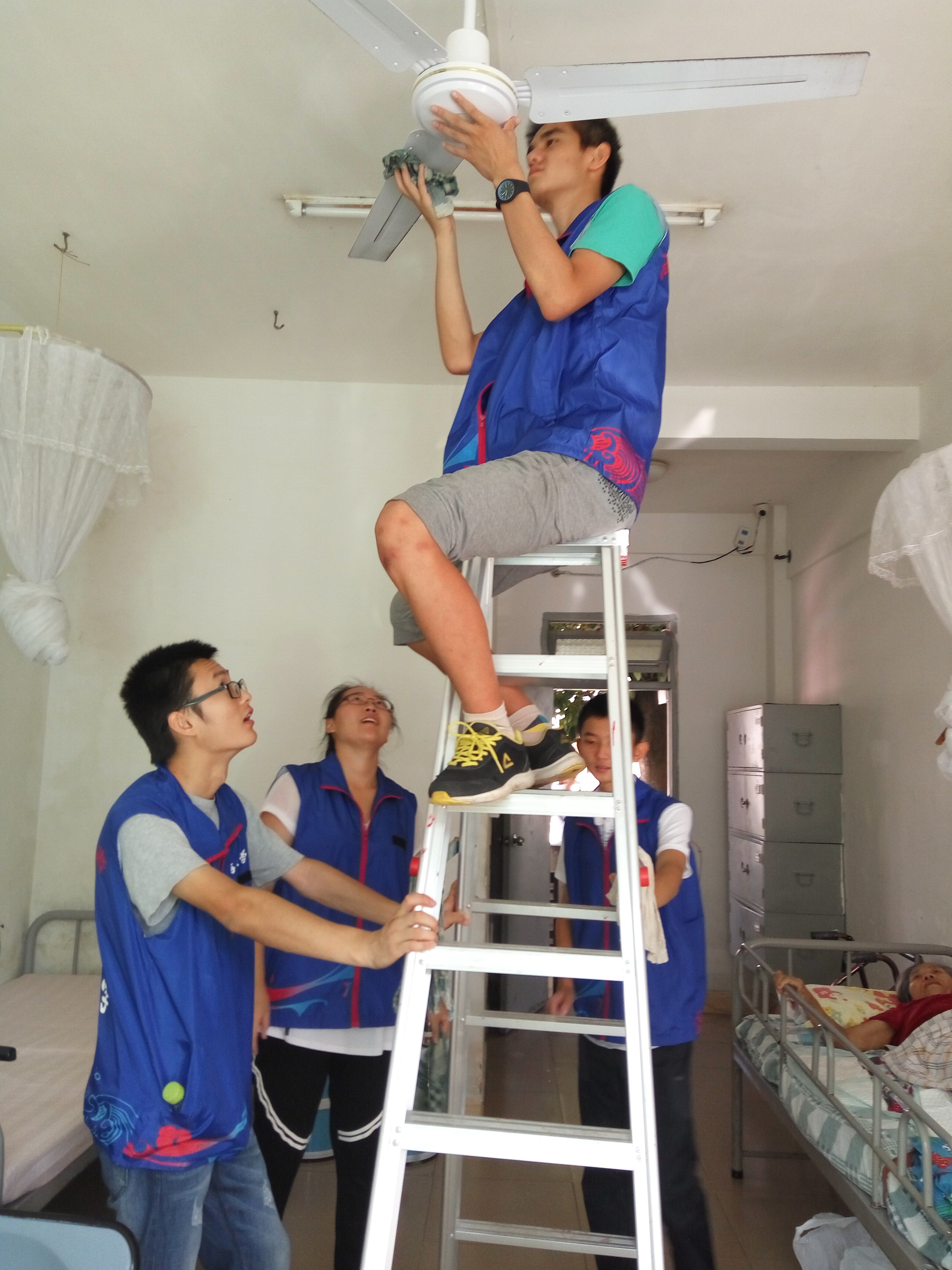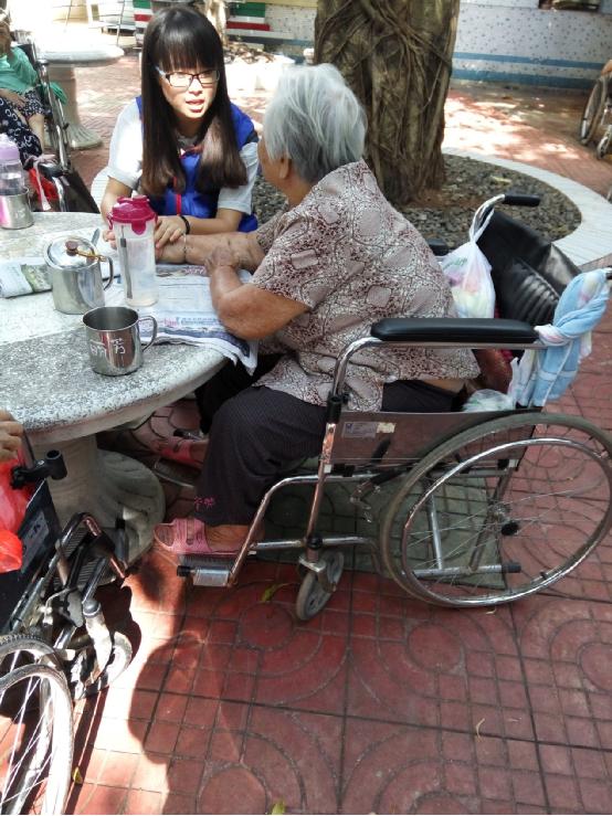 阳光带着舒适的温度,柔软地披在院子里的老人身上,志愿者们微笑地走进院子,如同走进自己的家那般自然。志愿者主动与老人交谈,很快便拉近了与老人之间的距离,长廊尽头,榕树底下,都能看见志愿者与老人促膝交谈。温情就这样在一言一语中传递。在老人的房间里,志愿者积极地打扫房间,一遍遍清洗抹布,细心地擦去灰尘,神情专注又认真。