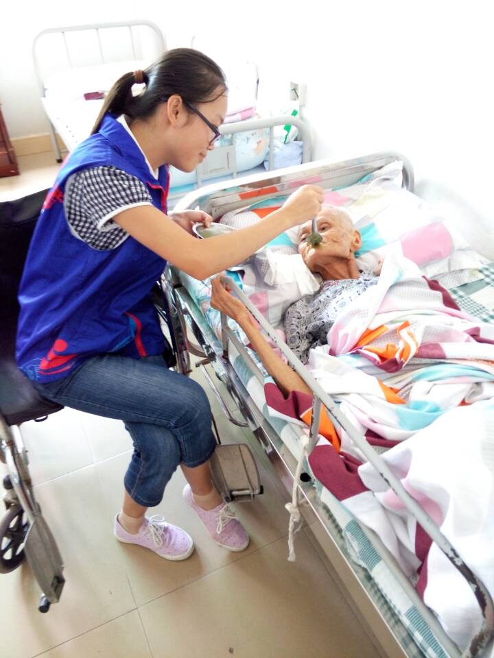 阳光下有老人紧握着志愿者的双手,床边有志愿者体贴地给老人喂午饭,榕树下志愿者为老人唱起激昂动人的红歌……这些感人的瞬间,都成为定格在相机里永不磨灭的回忆。