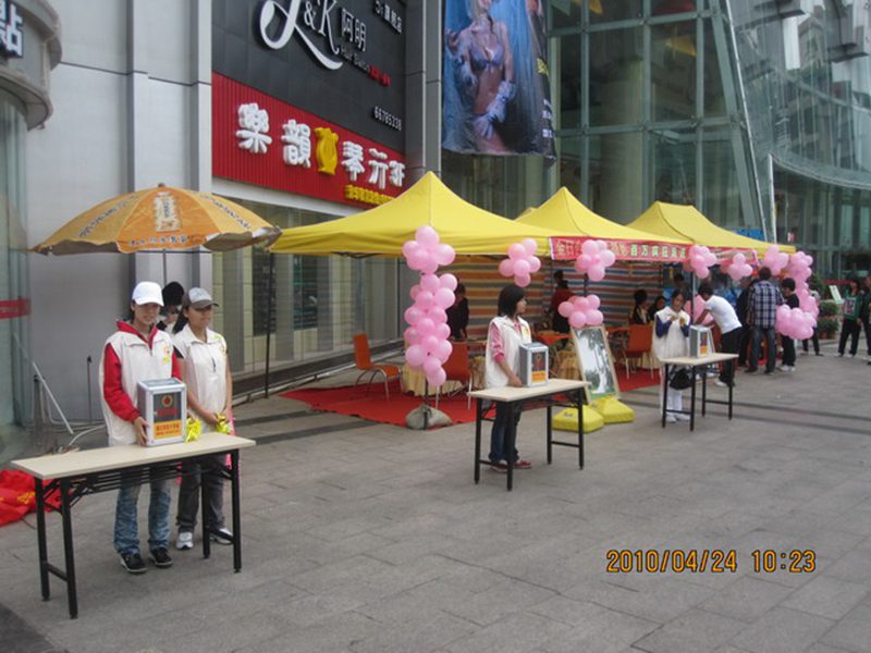 活动的主要地点在明珠广场和万国大都会。同学们抱着募捐箱,走向街头,向路过的行人进行募捐,并向捐款人贴上象征对受灾地区同胞哀思的黄丝带。捐款的人有垂暮的老人,有朝气蓬勃的青年,有小朋友,甚至还有三个高中生主动请缨帮忙募捐。即使在中午的蒙蒙细雨中,市民们仍坚持捐款。每一份捐款都值得我们表达深深的敬意,每一份捐款都是一份浓浓的爱心。