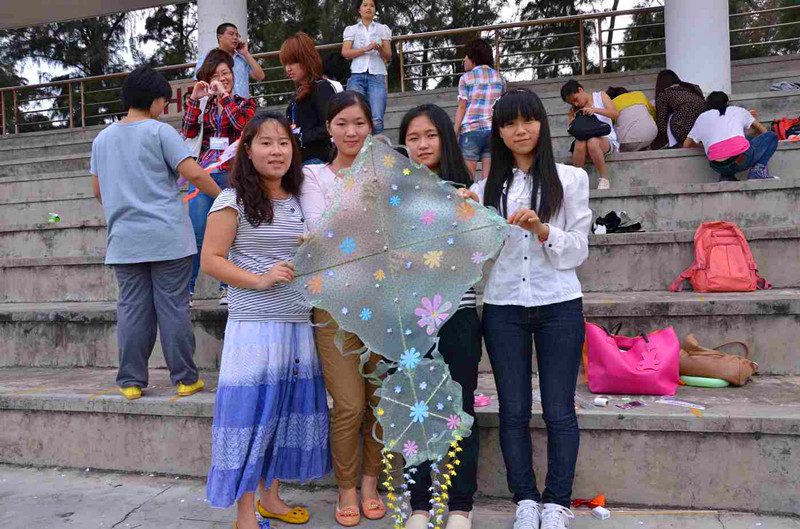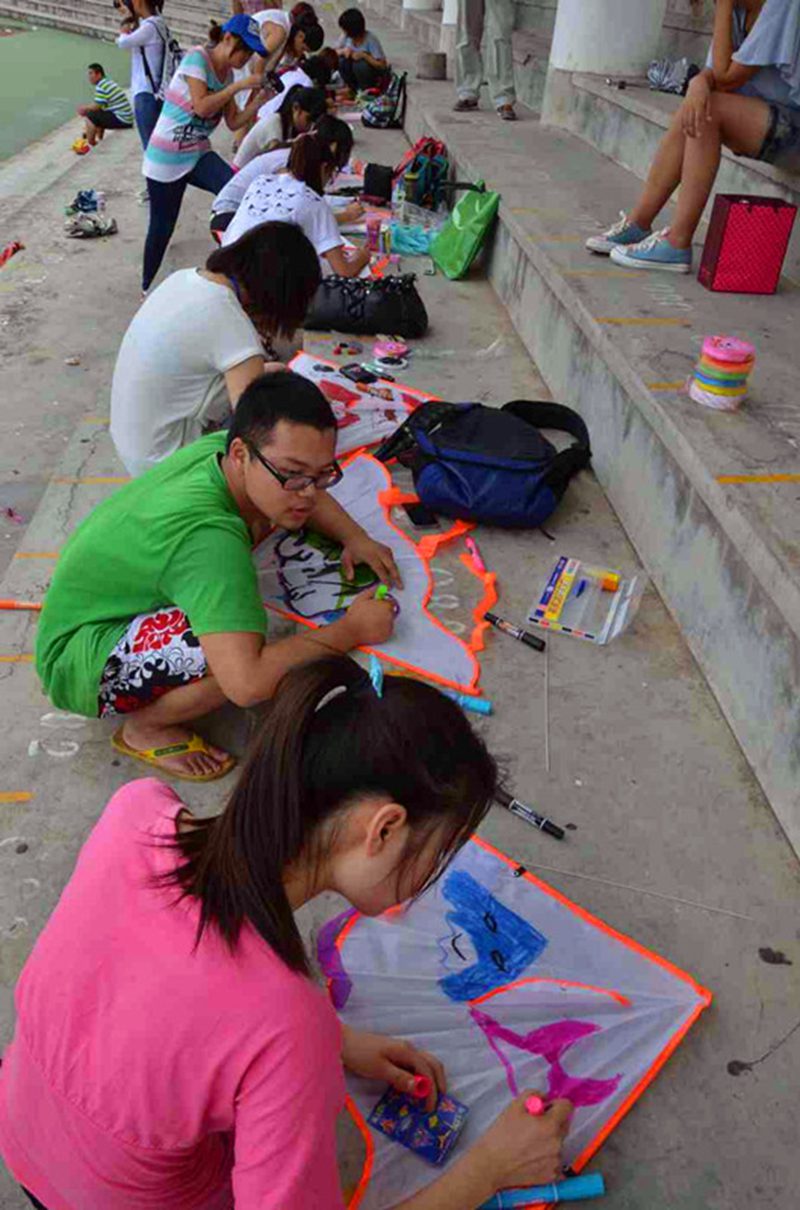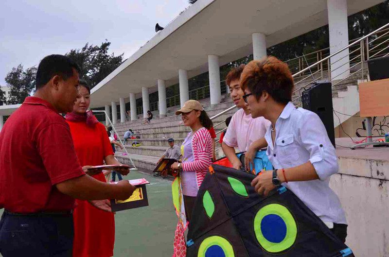 众多学院的同学们都参与了此次风筝节,热闹非常。 首先,由学工办主任公衍峰老师致开幕词,开幕式结束后比赛正式开始,DIY创意风筝比赛和放飞比赛同时开展。DIY创意风筝比赛分为涂鸦组和低碳组两个组别,比赛开始后,涂鸦组的参赛选手大多单独作战,都十分认真地在白色的风筝模版上进行个人的个性设计,低碳组的参赛选手则三五一组的方式进行手工创作,场面十分热闹。分别进行了40分钟和50分钟的比赛后,由选手将各色精美风筝进行展示并由在场的嘉宾等进行现场投票评选出前三名。放飞比赛分为晋级赛和决赛,由海南省风筝协会代表担任评委。晋级赛每组由五人组成,每一组评出第一名进入决赛,然后在决赛中评出放飞比赛前三甲。比赛过程中蓝天上各色风筝争相飘舞,绿茵场上各色人儿竞相奔跑,好不欢腾。