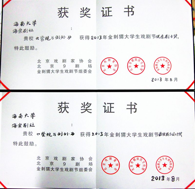 海棠剧社参演剧目《常规与例外》喜获本届金刺猬大学生戏剧节“最佳舞台设计奖”和“优秀剧目奖”,再次为我校争得殊荣。这些成绩的取得与学校党委陈封椿副书记、教务处、学生处以及学院领导的关怀、支持和帮助是分不开的。 海棠剧社《常规与例外》剧组于2013年8月10日在人文传播学院党委孙晓媛副书记和剧组指导教师邓菡彬老师的带领下应邀赴京参赛,冲击本届金刺猬大学生戏剧节奖项。《常规与例外》改编自德国戏剧大师布莱希特的经典作品,讲述一个商人企图霸占石油并虐待替他带路的向导,杀死一路上为他载重并好心给他水喝的苦力。苦力的妻子和商人对簿法庭,而法庭的判决却是商人无罪,并冠冕堂皇的拒绝苦力家属的上诉的故事。在人文传播学院邓菡彬老师指导下,该剧由2011戏剧影视文学专业学生陈传威执导,参赛演员及幕后均是2012级戏剧影视文学大一学生。 在比赛演出后的演后谈环节,大赛组委会评审专家充分肯定了我校大学生对经典戏剧勇于挑战的精神,对剧组解读布莱希特大师的方式也表示认同并提出成熟宝贵的意见 。演出的成功赢得了观众与评委的一致好评,最终摘得本届大戏节“最佳舞台设计奖”和“优秀剧目奖”。在京期间,中央人民广播电台和教育部主管、大学生体育协会主办的《阳光体育—新跃》杂志还对剧组师生进行了专访。 金刺猬大学生戏剧节创办12年来,以“热情、鲜明、纯粹”的形象,吸引着来自全国各地大学生戏剧爱好者,影响力辐射全国400余所高校。本届比赛共有包括中国传媒大学、中国戏曲学院、中国农业大学、中南大学、四川大学等20个省市的65所高校报名参加,我校海棠剧社《常规与例外》等12部戏剧作品作为优胜剧目入围终审。 海棠剧社是黑料正能量