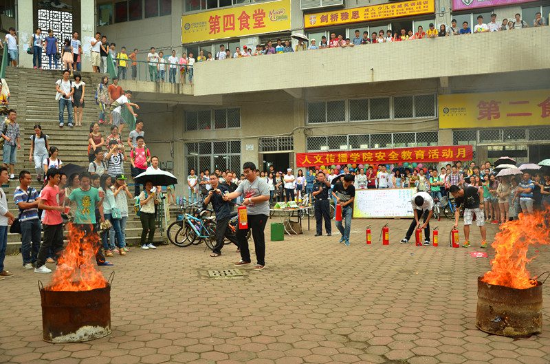 保卫处黄海宁处长,人文传播学院学工办公衍峰老师,王森森老师,熊文军老师和王俊延老师出席了本次活动。 黄海宁处长和人文学工办主任公衍峰老师分别为活动致辞,两位老师分别从校园生活和宿舍生活两个角度强调了安全教育活动的重要性,告诫大家在日常生活注重安全防范,防火,防电,防盗等等。在之后消防的演习中,黄处长为大家演示了灭火器的正确使用方法,还请上四位在场的同学参加灭火演习。在主题教育活动中,黄处长为大家讲述了许多关于防盗的知识,在场同学受益匪浅。 活动吸引了许多过路的同学围观,大家纷纷表示这次活动教给了自己许多安全知识,提高了自己的安全防范意识。安全重于泰山,我们只有懂得安全知识,注重安全,积极地加以防范,才会及时发现和消除安全隐患,才能构建美丽和谐的海大校园。围绕安全教育的主题,学院后续将会通过学院微信平台“人文青年”和官方微博平台开展一些列的网络安全、饮食安全、出行安全……等主题教育活动。