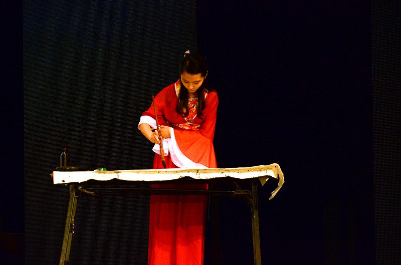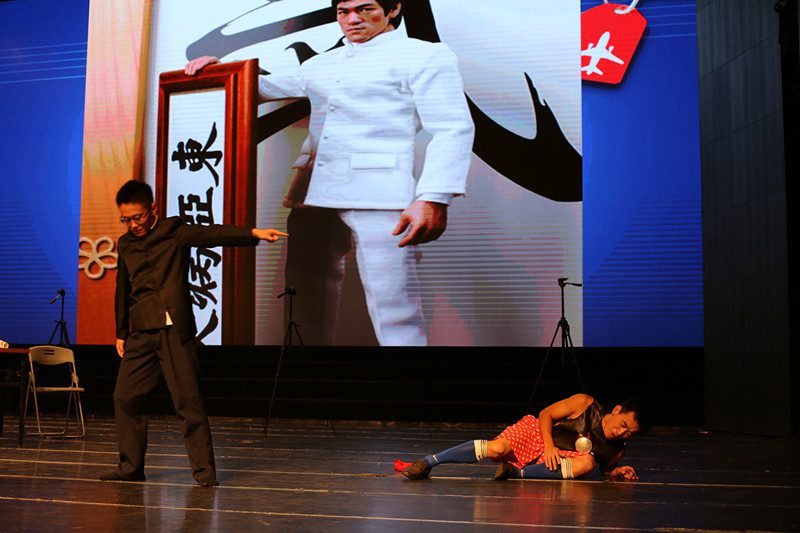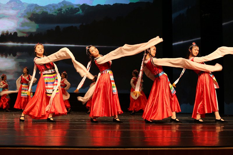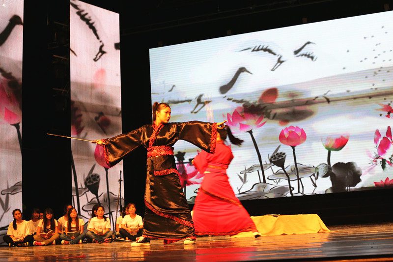 团委副书记陈广锐老师、人文传播学院党委书记王兆庆教授、食品学院团委书记姚广龙老师及人文传播学院学工办全体老师。担任本次大赛的评委有人文传播学院党委副书记孙晓媛老师、人文传播学院副院长石晓岩老师、戏剧影视文学系主任张军军老师、中文系主任张硕果老师与新闻传播学系主任何晶娇老师。 本次文艺汇演以专业为单位每个年级每个专业各选送一个节目参加比赛,12组节目小组分三段进行比赛。由团委学生会成员带来的配乐古文朗诵《大学》拉开了本次汇演的序幕。气势高昂的朗诵配之以抑扬顿挫的鼓点和悠扬婉转的古筝,引领观众一起进入中华经典之美的领略和欣赏中。 在首段比赛中,由13级广告专业带来的民族舞蹈《敦煌神韵》凭借着华美的服饰,曼妙的舞姿,将敦煌这片文化与艺术圣地的独特风情充分展示了出来。11级戏剧影视文学专业的同学发挥专业优势,精心组织和编排的戏剧短剧《中华与世界》依靠着感人励志的剧情,风趣幽默的表演形式赢得了大家的喜爱。“孔雀东南飞,五里一徘徊”,由11级中文专业带来的古诗文朗诵《孔雀东南飞》在悠扬的古筝声中带给了观众强烈的艺术熏陶。紧接着13级中文的姑娘们也为大家献上了民族舞蹈《走在山水间》,身着民族节日盛装的她们与山水融为一体,优雅动人。青年志愿者协会带来的手语表演《爱的翅膀》展现了一年来黑料正能量