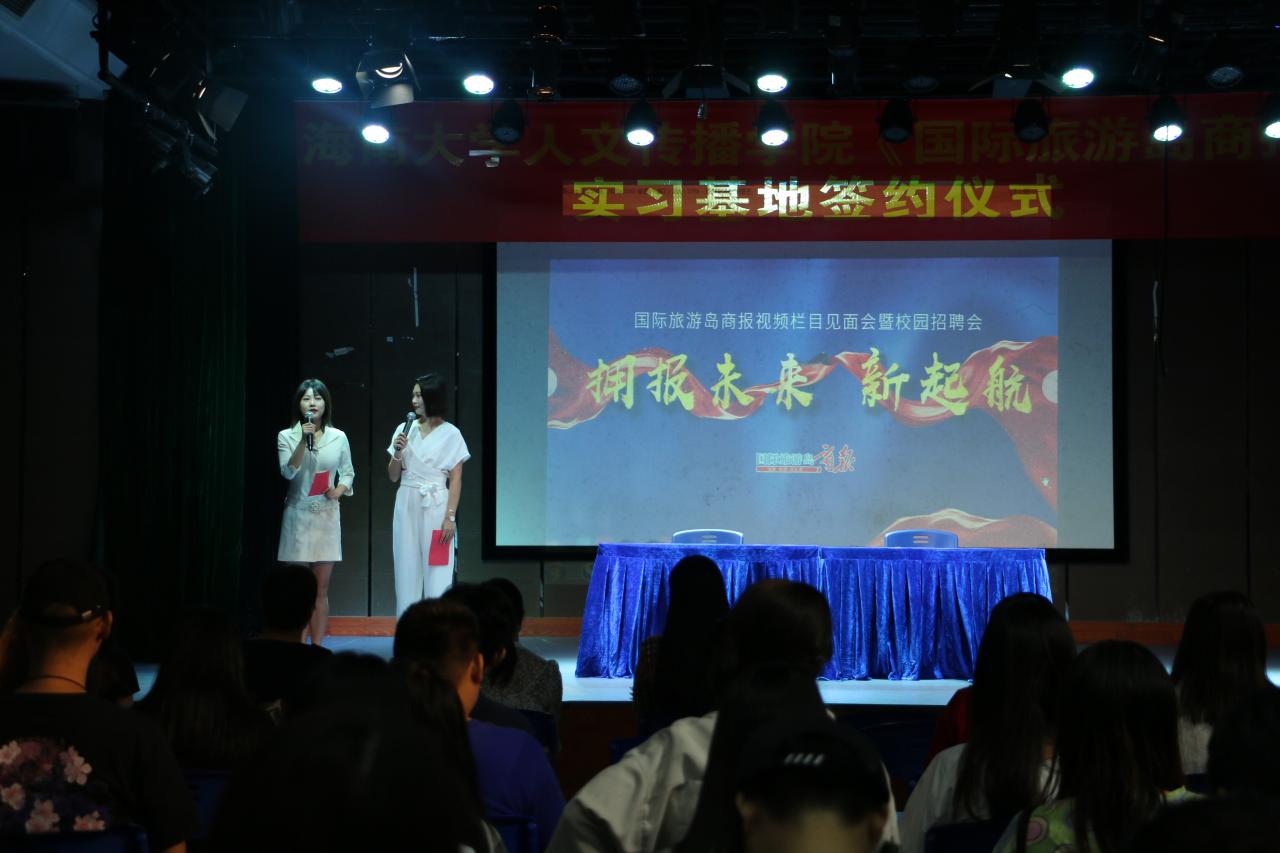 签约仪式由《国际旅游岛商报》主播符由嘉、出镜记者刘宁玥主持,导演兼制片人张泽瑜嘉、总编助理兼全媒体融合采编中心副总监常珊珊、采访中心主任段然、新媒体中心主任张慧莹、直播运营李晨阳、策划专员滕鹏飞与李美琴以及视频组成员刘顺德、戴铭、王世杰、李瑶、郭晃共同参加。主持人首先介绍了出席本次活动的嘉宾及《国际旅游岛商报》的基本情况,表达了与学院建立合作关系的愿望。