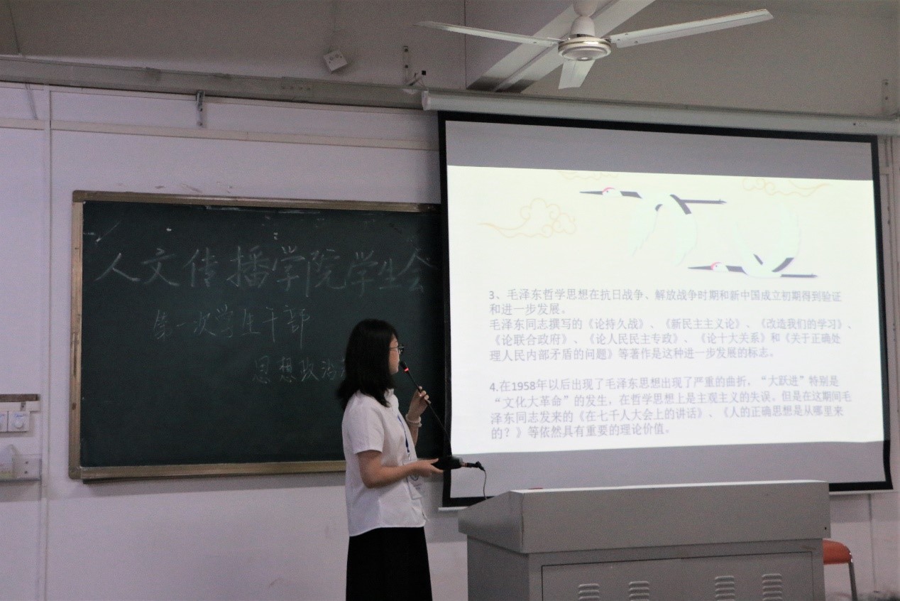 为贯彻落实党的指导思想,引导青年学生增进对毛泽东思想的深刻理解,使学生树立正确的世界观、人生观、价值观、历史观,成为能够担当民族复兴大任的时代新人,人文传播学院学生会于10月18日在城西教学楼8C01教室召开学生会思想政治教育大会。