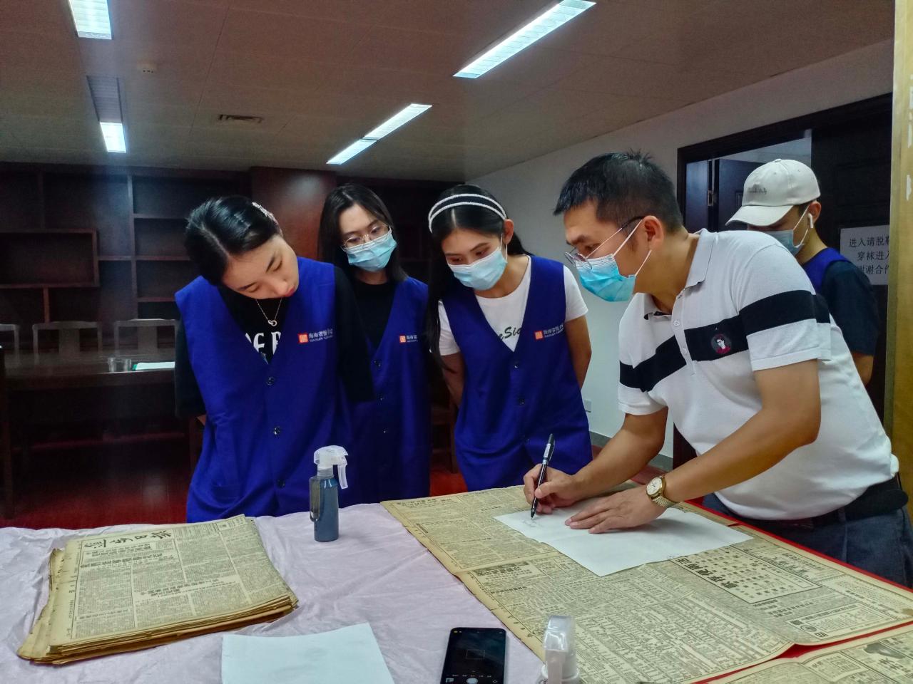 志愿者们大多是首次参加古籍特色保护活动。在活动开始前,志愿者们先由古籍修复黄老师带领前往古籍展览室参观阅览。黄老师为志愿者们详细讲解古籍类别、古籍的印刷装帧等知识,让志愿者们在着手工作前对古籍修复有一个大致了解。参观完毕后,志愿者们前往古籍修复室学习如何保护、修复古籍。下午四点,四名志愿者去往地方文献区搬运书籍,其余志愿者留在古籍修复室,配合老师完成陈旧报刊的刷酸工作。活动过程井然有序,志愿者们对古籍保护表现出浓厚兴趣,现场氛围良好。