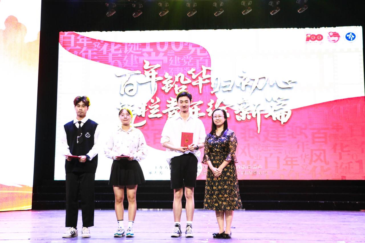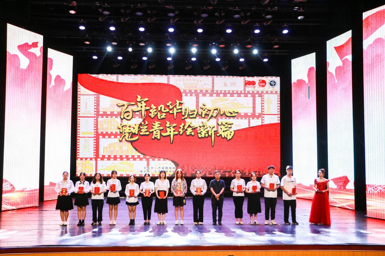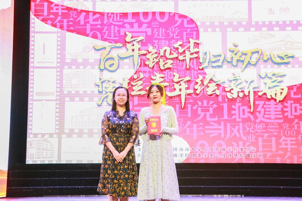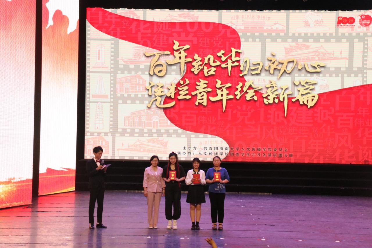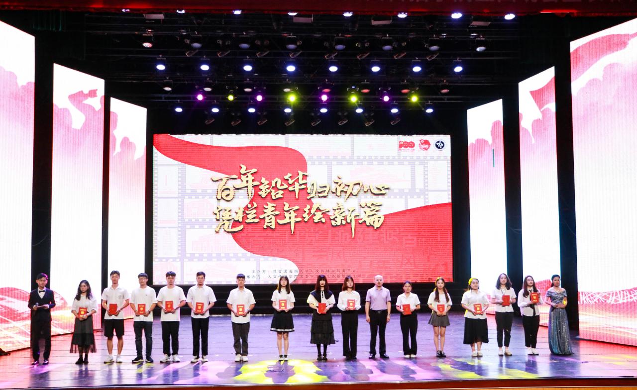 文艺学生积极分子”奖项获得者进行表彰,学院党委副书记罗邻球为他们颁奖。一场无与伦比的视听盛宴来到尾声,晚会进入了最后的节目颁奖环节,由石晓岩副院长为我们宣读并颁发了一等奖--19新传队《觉醒年代》;二等奖--20戏影队《重中之重》、20中文队《弘五四梦扬青春情》;由李彩霞副院长为我们宣读并颁发了三等奖--20新传队《烈火战马》、19中文队《国家》、19汉教队《改革又绿海南岸》以及人气奖--20戏影队《重中之重》。