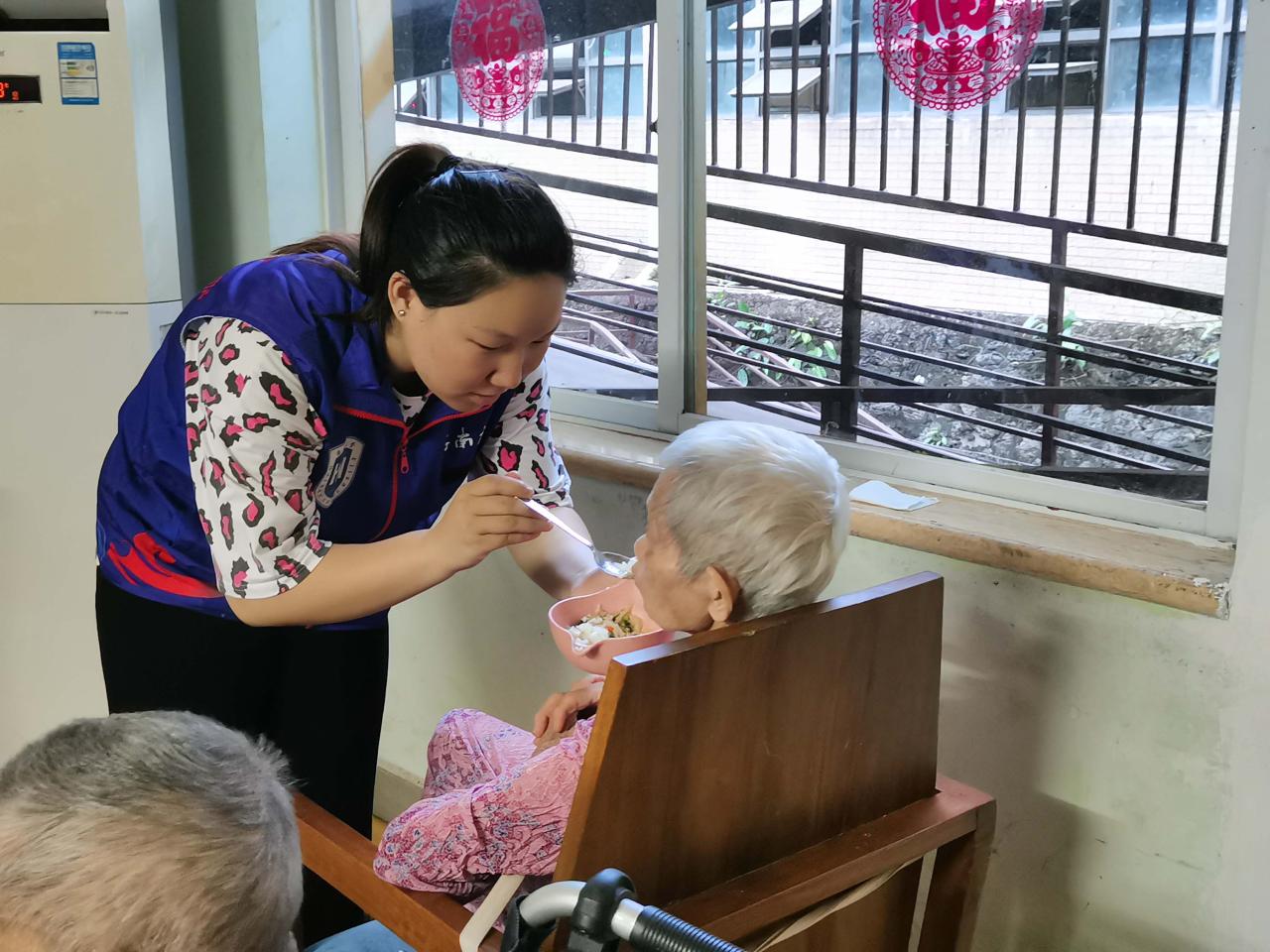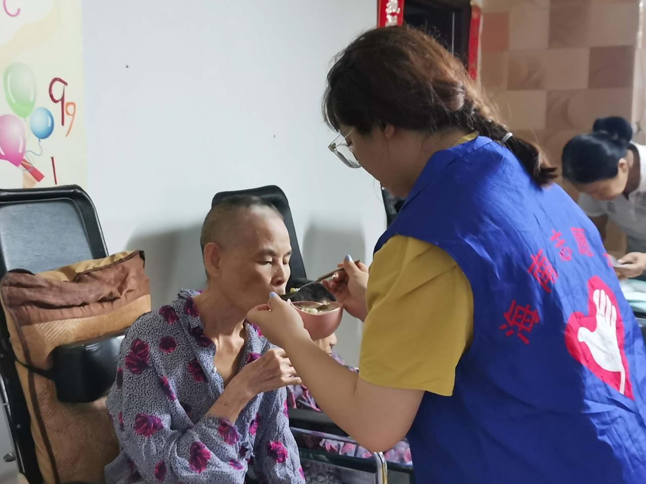 在进行了常规的体温测量和登记之后,志愿者们进入房屋。经由护工仔细讲解照顾老人的注意事项后,志愿者们分组开始工作。志愿者们分为照顾老人、打扫卫生两大组。照顾老人的志愿者们有的为老人按摩身体,有的陪老人聊天解闷。在晚饭时间,志愿者们耐心地喂给老人吃食。当老人因反应不灵敏,不能含住食物时,志愿者们也耐心地将食物残渣从老人嘴角拭去。负责打扫卫生的志愿者们在清洗好卫生工具后,仔细清理地面、窗台边等卫生死角,也将床下的收纳箱收拾整齐。活动有序进行,现场气氛其乐融融。