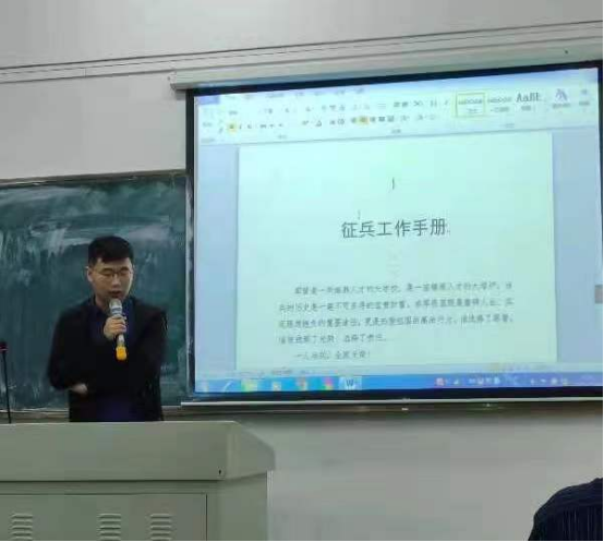 宣讲会上,刘扬老师首先从报名阶段、材料提交、体检送审、学籍保留等方面做了详细说明,并介绍了关于应征入伍的一系列信息和相关要求,主要包括每年春季和夏秋季的征兵时间,身体素质要求,征兵入伍的相关流程。其次,刘扬老师对大学生入伍的优惠政策进行解读。刘扬老师指出,投身军营,参军入伍,是每个适龄公民应尽的责任和义务。同时参加宣讲的学生集体观看了优秀退役士兵代表的演讲视频,更加直观地感受到了大学生军人的风采,更加真实地了解学生入伍后的生活。最后刘扬老师提出希望广大有理想、有抱负、有知识的青年大学生积极响应党和政府的征兵号召,把个人理想抱负融入强军梦、中国梦,踊跃报名应征,到部队中成长和锻炼自己,为国防事业贡献力量。