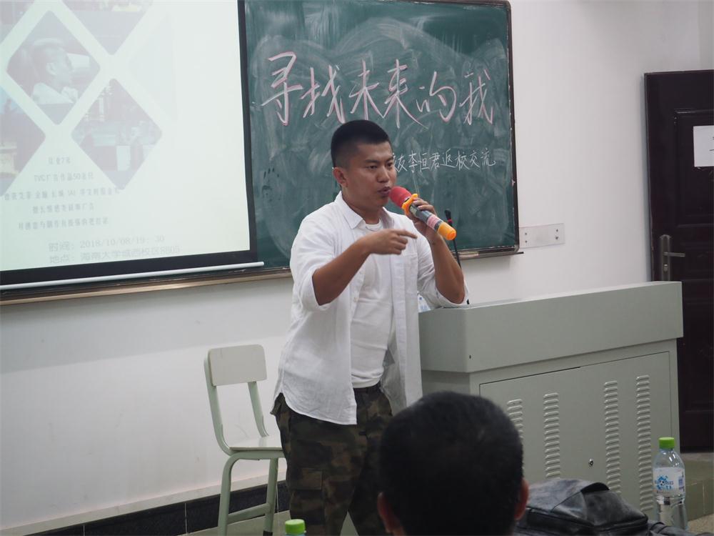 的形象宣传片,每每校友们和学校师生看到那熟悉的校园景象,都会油然而生一种自豪感。现在,李恒君校友正在向更高的目标奔跑,将来会进军电影行业,希望执导出优秀的电影作品。 分享环节结束后,李恒军校友与同学们进行了现场交流互动,很多同学提出了自己关心的问题,有关于专业学习方面的、生涯规划反面的、广告制作方面的、电影创作方面的……李恒君都耐心地进行了回答,帮助同学排解了困惑,理清了思路,明确了方向。 此次活动是生涯发展中心举办的“寻找未来的我”系列活动之一,今后还会继续邀请各专业毕业的杰出校友返校交流,同时也会开展相关的其他活动。活动的目的在于让同学们能够从杰出校友身上汲取营养,思考自己的未来,对自己的生涯进行合理规划,最终度过充实的四年大学生活,为自己的未来积蓄能量。