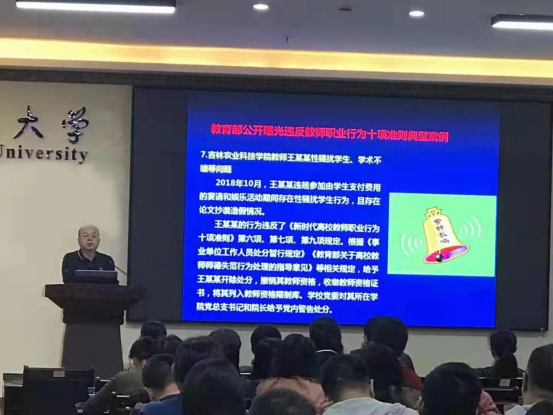 师德负面清单和失范行为处理办法》。并结合《新时代高校教师职业行为十项准则》,深入剖析了教育部公开曝光违反高校教师职业行为十项准则典型案例7起,教育引导全院教师时刻自重、自律、自警、自省,恪守职业道德,规范从教行为。